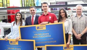 Za izuzetan uspeh Banka je sa po 100.000 dinara nagradila Katarinu Petrović (18), Vuka Radovića (19) i Milenu Vuletić (19), koje je ovaj čuveni univerzitet svrstao među pet najboljih mladih matematičara i fizičara iz zemalja van Evropske unije.