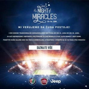 Počevši od 15. juna u 15h pa sve do subote, 16. juna do 16h, trajaće #Night of Miracles u kojoj učestvuju svi ovlašćeni prodavci FCA grupe: Fiat, Alfa Romeo i Jeep brendova, a zanimljivost je što će svi prodajni saloni vozila biti otvoreni i tokom noći i omogućiti posetu kupaca van standardnog radnog vremena.