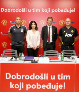 Slavica Pavlović, predsednik IO Eurobank, Ves Braun, legenda Mančestera, Sajmon Hopi i Robin van der Lan, glavni trener Mančester junajted škole fudbala