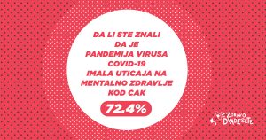 Rezultati ankete o mentalnom zdravlju mladih u Srbiji, koju je realizovala platforma „Zdravo dvadesete“ kompanije Galenika, pokazali su da ispitanici u dvadesetim godinama u velikoj meri osećaju promene kada je njihovo mentalno zdravlje u pitanju, a koje su nastale kao posledica pandemije Covid19 (72,4 odsto ispitanih).