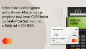 Prateći praksu koja je već sprovedena u 29 zemalja koje su promenile CVM limite u prethodnom periodu, Mastercard objavljuje povećanje CVM limita za beskontaktna plaćanja sa 3.000 RSD na 4.000 RSD u Srbiji od 15. aprila 2020. godine. Povećanje limita za beskontaknta plaćanja za krajni cilj ima unapređenje korisničkog iskustva prilikom kupovine.