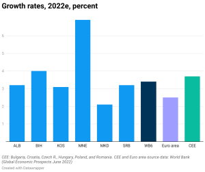 U svim državama Zapadnog Balkana zabeležen je ekonomski rast u prvoj polovini 2022. godine, zahvaljujući privatnoj potrošnji i investicijama, koje su bile ključni pokretači rasta. Rastuće plate i doznake, zajedno sa povećanjem privatnih kredita, povećale su privatnu potrošnju. Investicije su bile posebno jake u Severnoj Makedoniji, Srbiji i Bosni i Hercegovini, navedeno je u Izveštaju Svetske banke za Zapadni Balkan. Međutim, s obzirom na usporavanje privrede u drugoj polovini ove godine, očekuju se različite stope rasta u državama Zapadnog Balkana: najveći rast od gotovo sedam odsto zabeležiće Crna Gora, za njom sledi Bosna i Hercegovina sa četiri odsto rasta, pa Albanija i Srbija sa po oko 3,2 odsto rasta, dok će najniži rast imati Severna Makedonija od oko 2,2 odsto. Ukupno, ceo Zapadni Balkan, trebalo bi da zabeleži rast od oko 3,4 odsto, dok će države Evrozone imati oko 2,5 odsto rasta, a države CEE nešto iznad 3,5 odsto rasta (Grafikon Svetske banke).