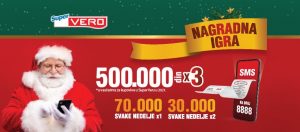 U toku trajanja nagradne igre, od 3. do 30.12.2020, svake nedelje biće podeljeno 70.000 dinara i dva puta po 30.000 dinara za kupovinu u Super Veru. Glavna nagrada je 500.000 dinara za kupovinu, koja se izvlači na kraju nagrade igre i to 3 dobitnika. Nagrade se dodeljuju u vaučerima za kupovinu u Super Vero marketima u 2021 godini. Uz ovakve nagrade, sami ćete najbolje znati kako da obradujete sebe i svoje najdraže kvalitetnom ponudom koju vam pruža bogat asortiman Super Vera. Učestvujte u nagradnoj igri i sa osmehom na licu i punim kesama u rukama – zakoračite u Novu godinu.
