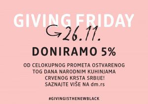 Tako će i ovog poslednjeg petka u novembru drogerijski lanac usmeriti pet odsto od celokuponog prometa tog dana narodnim kuhinjama Crvenog krsta Srbije. Ovaj globalno popularni dan u kompaniji dm nosi naziv Giving Friday, a navedenu inicijativu drogerijski lanac sprovodi na nivou cele dm Grupe pod sloganom Giving is the new black.
